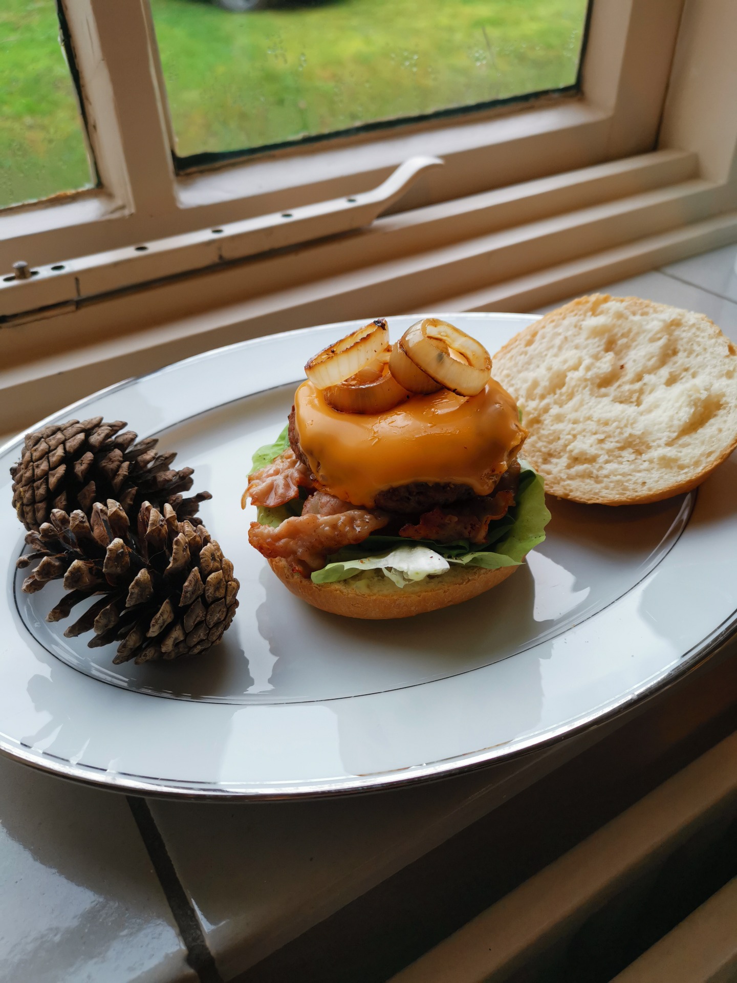 Als lievelingsgerecht heb ik voor hamburgers gekozen. Ik was vergeten een foto te maken van mijn burger dus heb een foto gemaakt van de burger van mijn broer, ik ben een vegetariër dus ben niet zo blij met de duidelijke bacon en hamburger op de foto. In de tuin heb ik dennenappels gevonden en heb deze erbij gelegd als 'bijgerecht'.