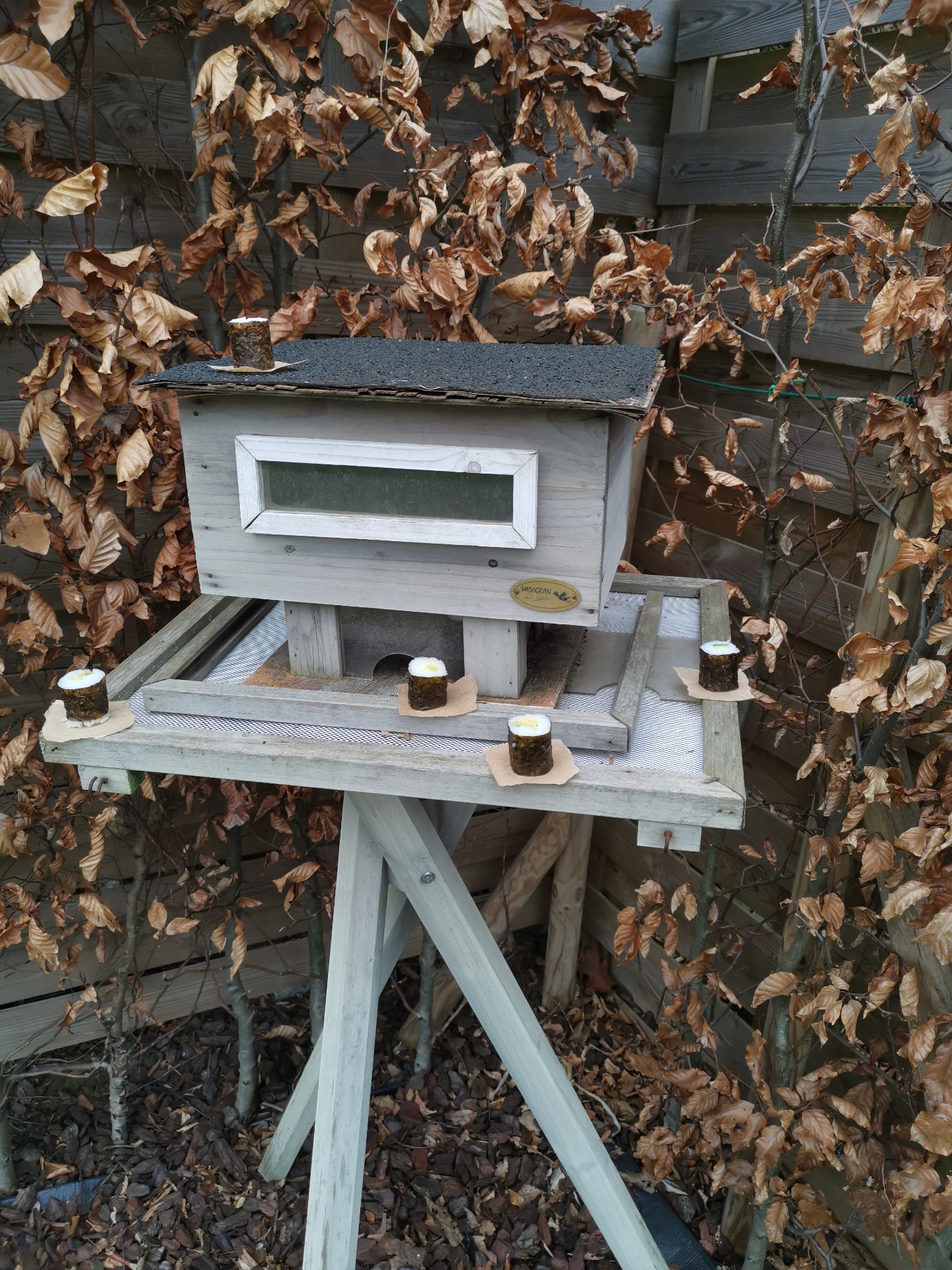 Een van mijn andere favoriete gerechten is sushi. Ik heb een aantal sushi op de voerderbak voor de vogels in onze tuin gezet. Ik heb ze gezet als vogels die zaadjes komen eten.
