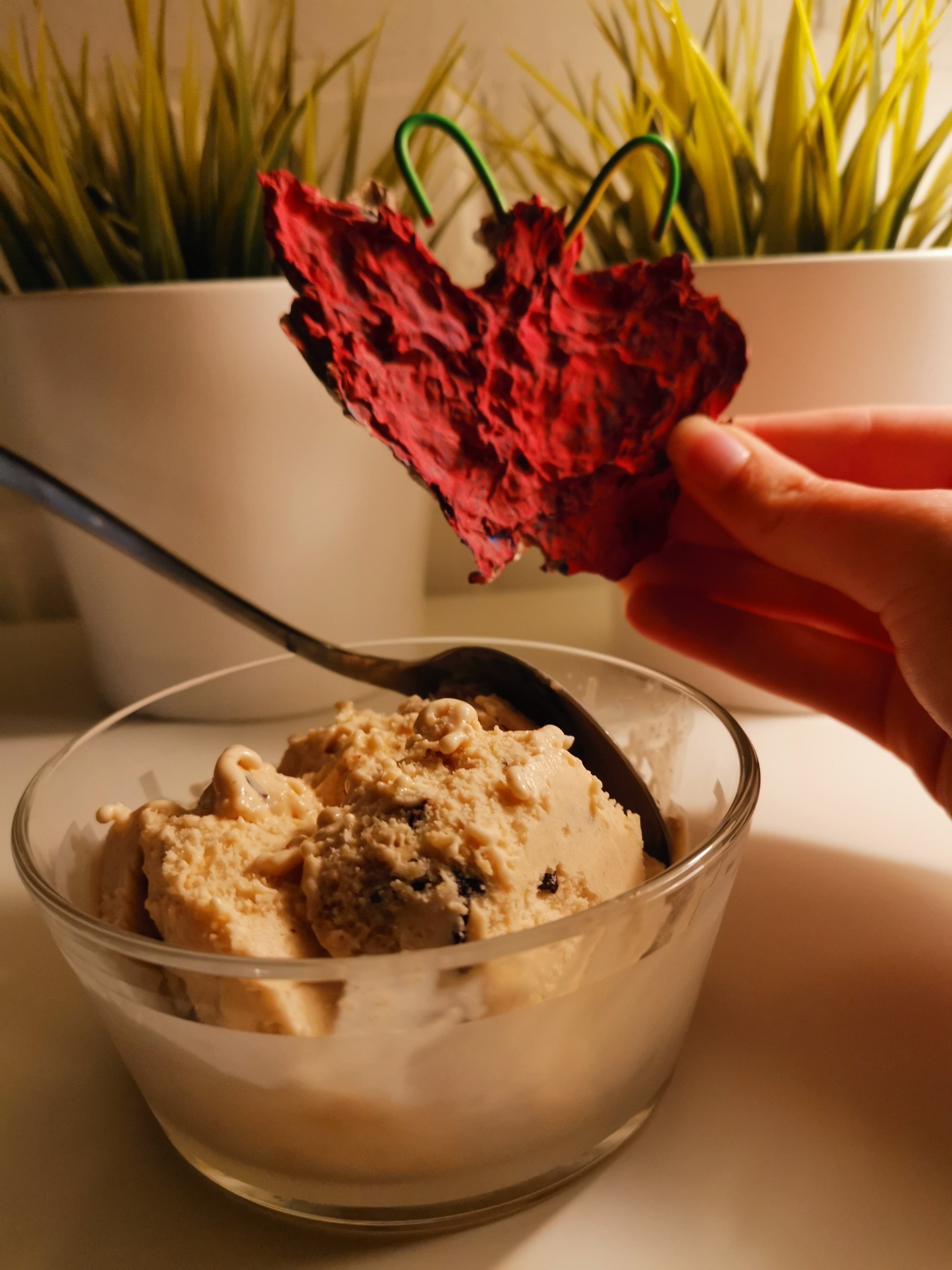 Voor favoriete dessert heb ik mijn ijs proberen veranderen in wolken door de vlinder die erbij vliegt. De planten erachter waren eerst niet de bedoeling in de compositie maar lijken voor mij nu op bomen in de verte.