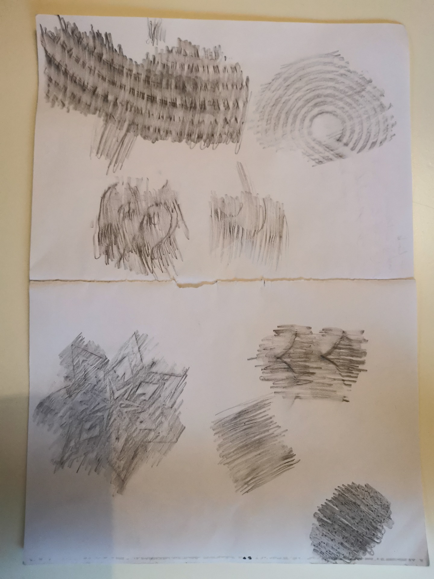 Ik heb stukken A5 papier gebruikt omdat ik geen volledig leeg blad ter beschikking had. Om te beginnen heb ik in huis gezocht naar voorwerpen waar ik op kon frotteren om het effect te zien op papier. Nadat ik een equivalent van een A4 aan probeersels had heb ik hier iets in proberen te zien.