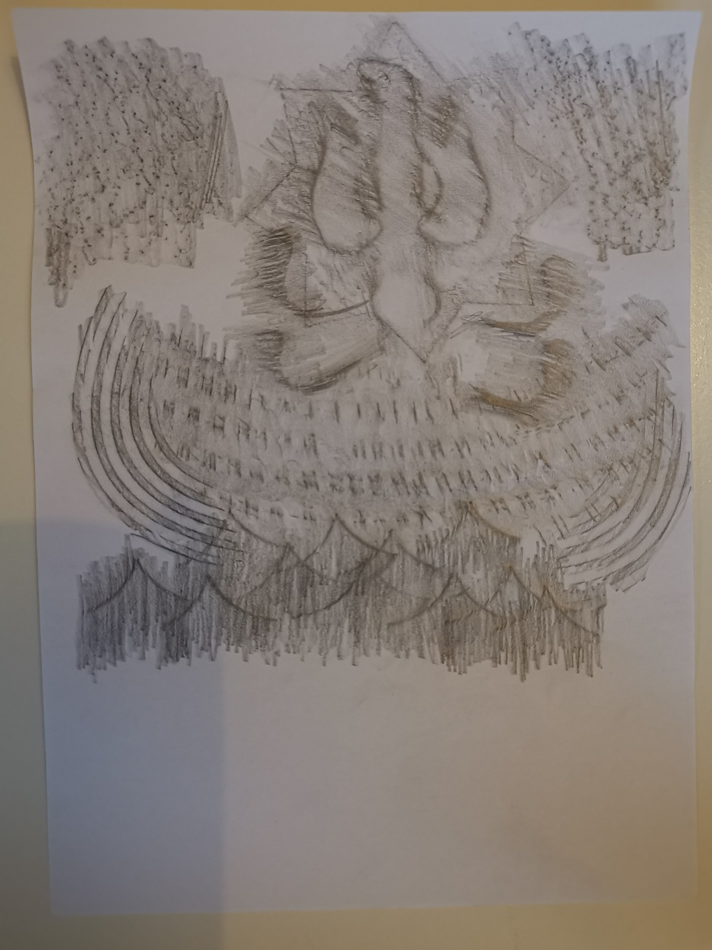 Ik heb de opdracht in mijn comfortzone geplaatst omdat ik het wel leuk vond om heen en weer door het huis te lopen op zoek naar andere interessante vormen om te frotteren en om mijn figuratieve tekening groter te zien worden.
